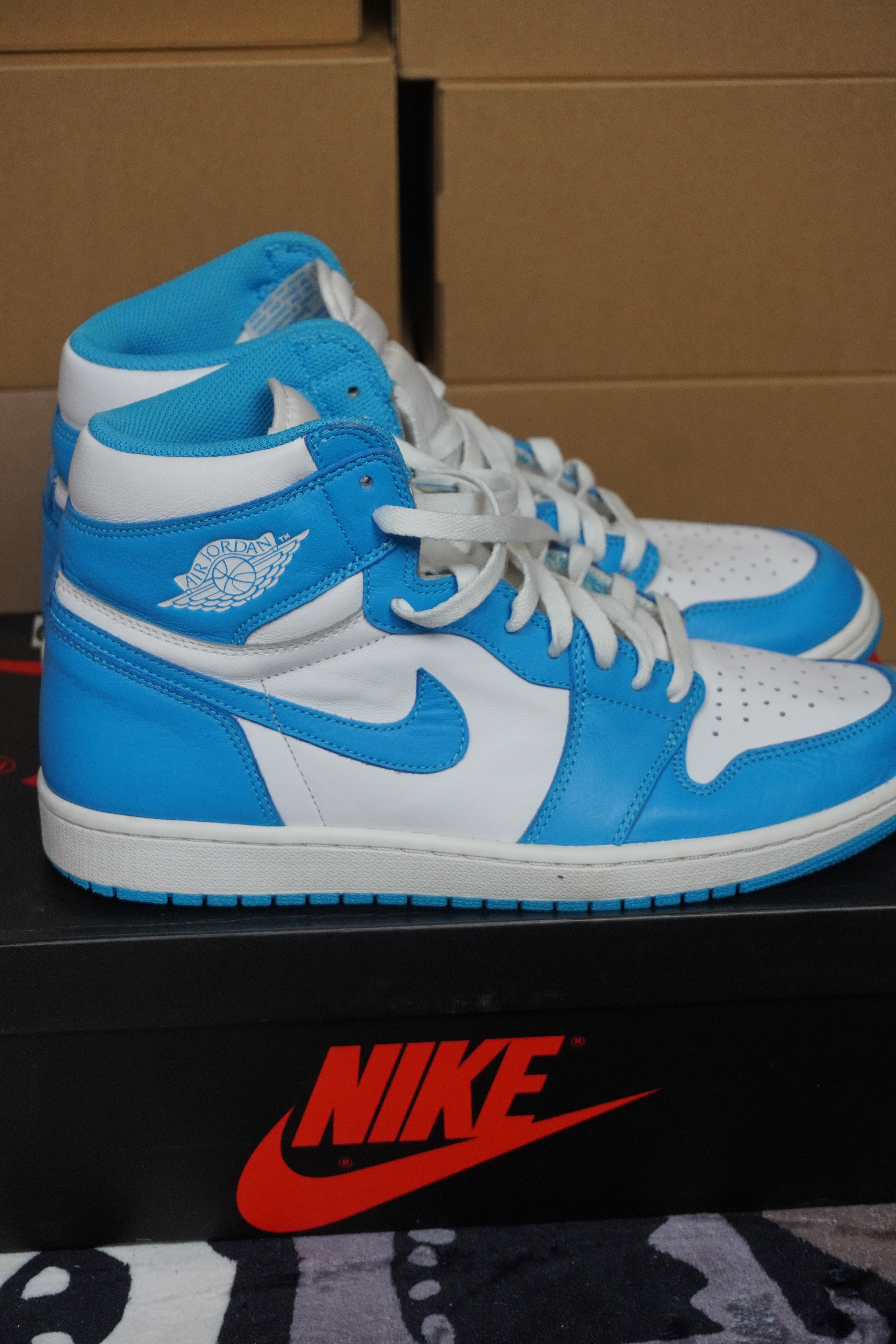 Originally released in 1985, the Air Jordan 1 Retro High OG 'UNC' made a comeback as part of Jordan Brand's Holiday 2015 retro pack. It features a blue and white colorway that pays homage to Michael Jordan's college years at the University of North Carolina, where he won the 1982 NCAA National Championship as a freshman. The shoe includes classic branding details, such as the Nike Air logo on the tongue, the Air Jordan 'Wings' logo, and a clean heel.