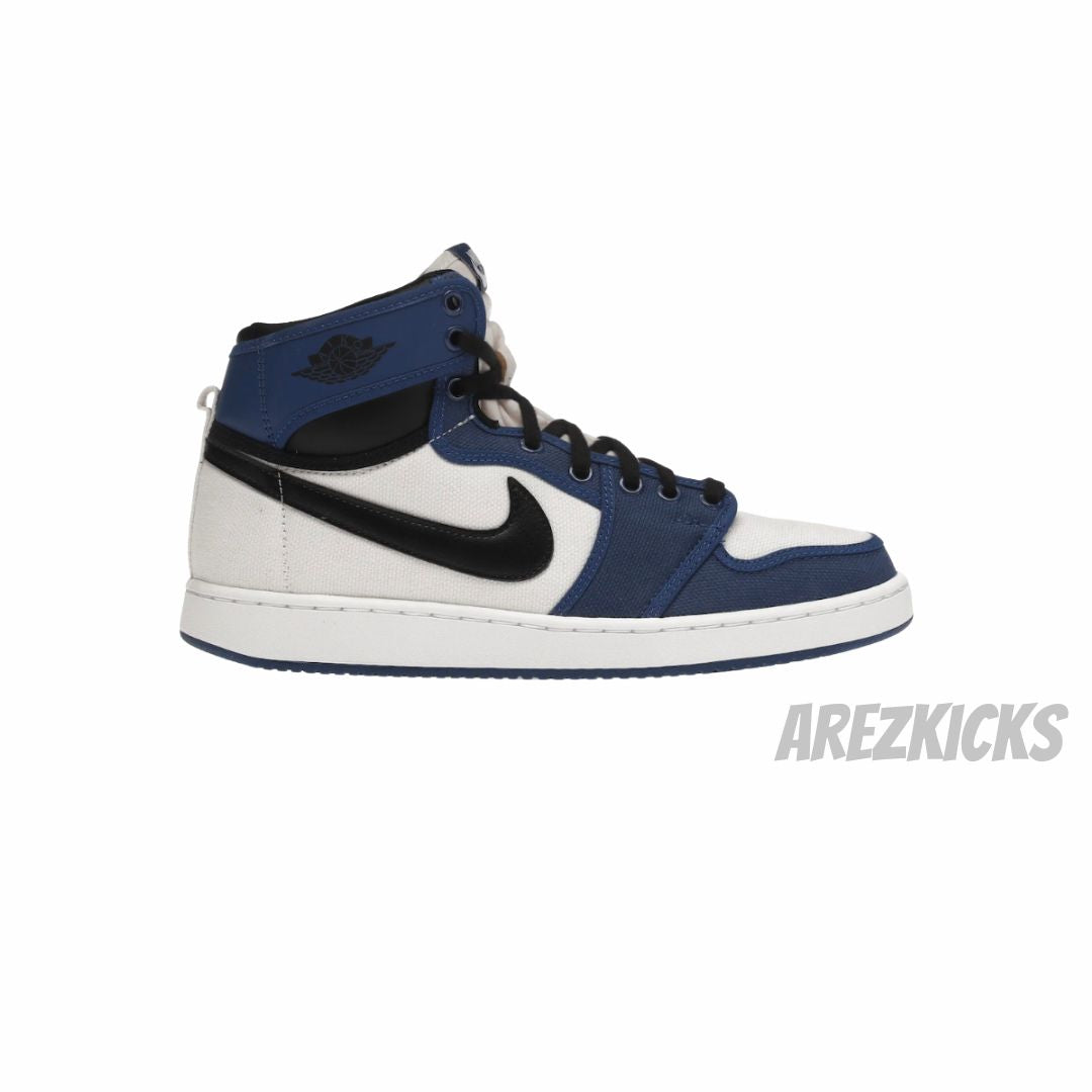 The Air Jordan 1 AJKO showcases a captivating "Storm Blue" color scheme. This high-top iteration boasts a pristine white canvas on its foundation, while the black leather accents on the Swoosh and ankle add a striking contrast. Completing the design with finesse and comfort is a two-toned rubber sole.