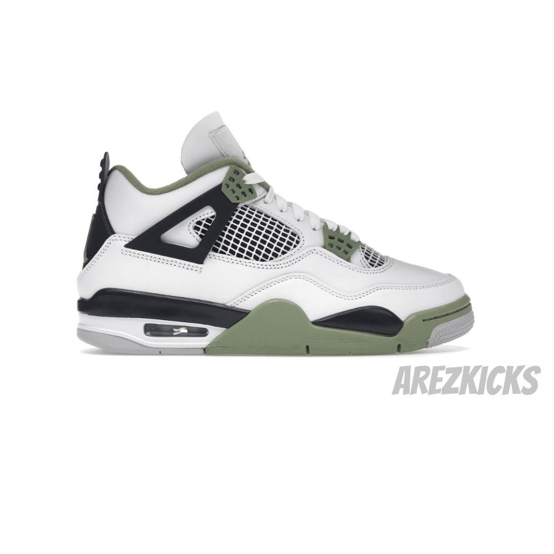 The Women's Air Jordan 4 Retro 'Seafoam.' This sneaker combines the best of the OG 'Fire Red' release from 1989 with a modern twist of pastel magic. The pristine white leather upper is accented with Oil Green eyelets, interior lining, and Jumpman branding hits on the tongue tag and molded heel tab. Plus, the quarter panel netting and support wings bring an extra slice of heritage to the mix. The polyurethane midsole, complete with a visible Air-sole unit in the heel, provides a plush ride while the forefoot gets a refreshing splash of green. You'll be turning heads with every step
