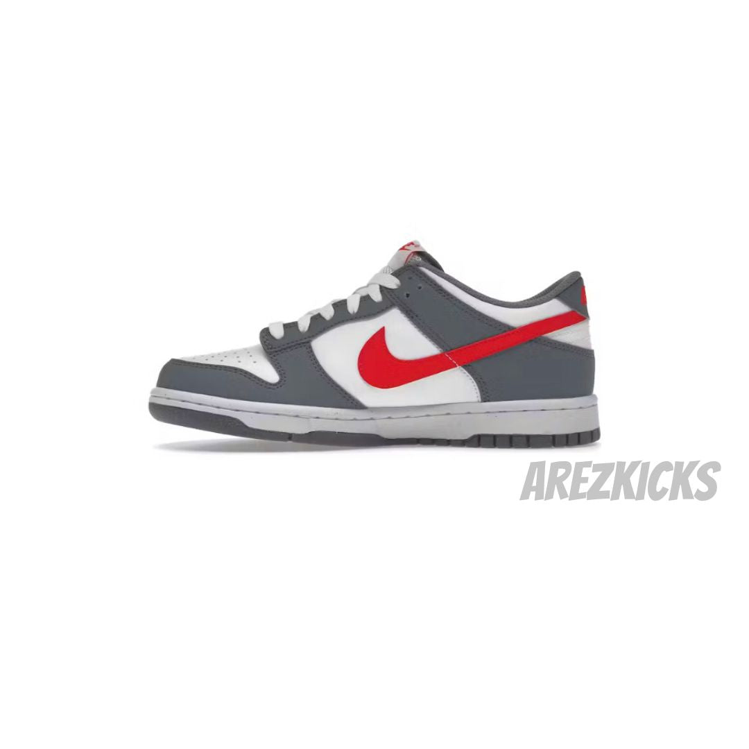 ke's Dunk Low Next Nature "Smoke Grey Light Crimson" GS sneakers offer a perfect blend of style and comfort. They feature a white leather upper with grey and light crimson accents, a lace-up closure, and a padded collar for ankle support.